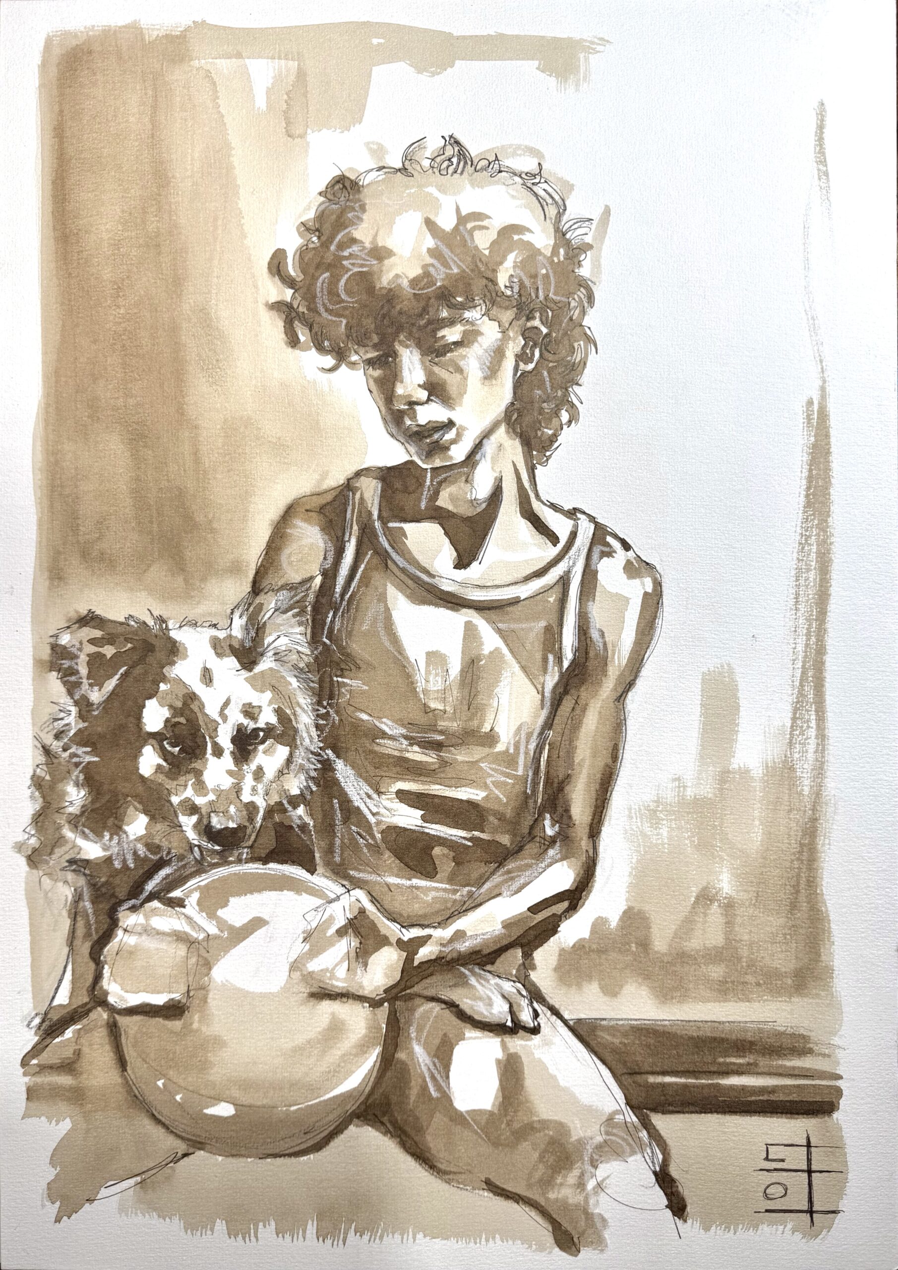 « Boy & collie playing football » Brou de noix & encre sur papier Format 51x36cm 2025